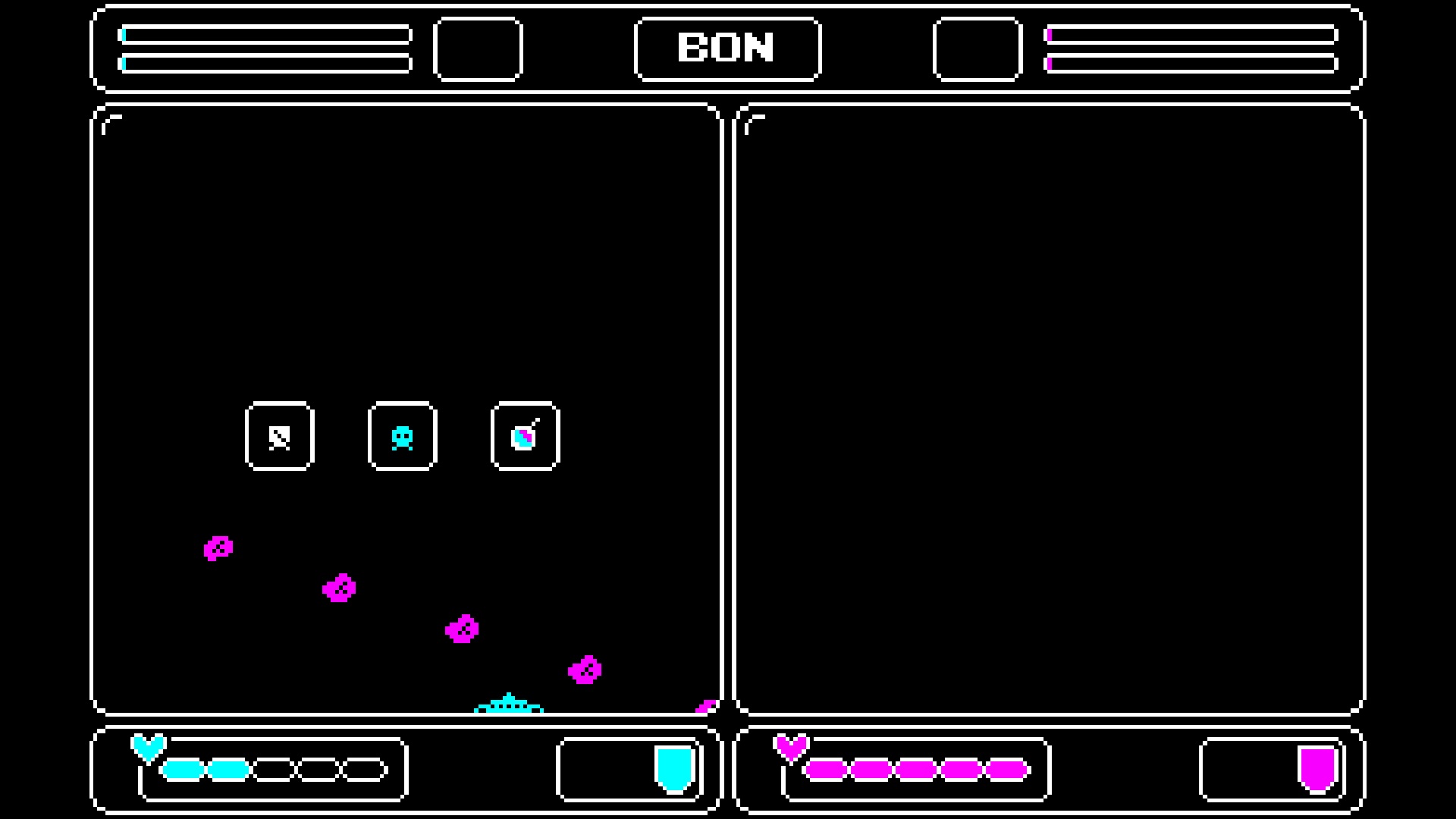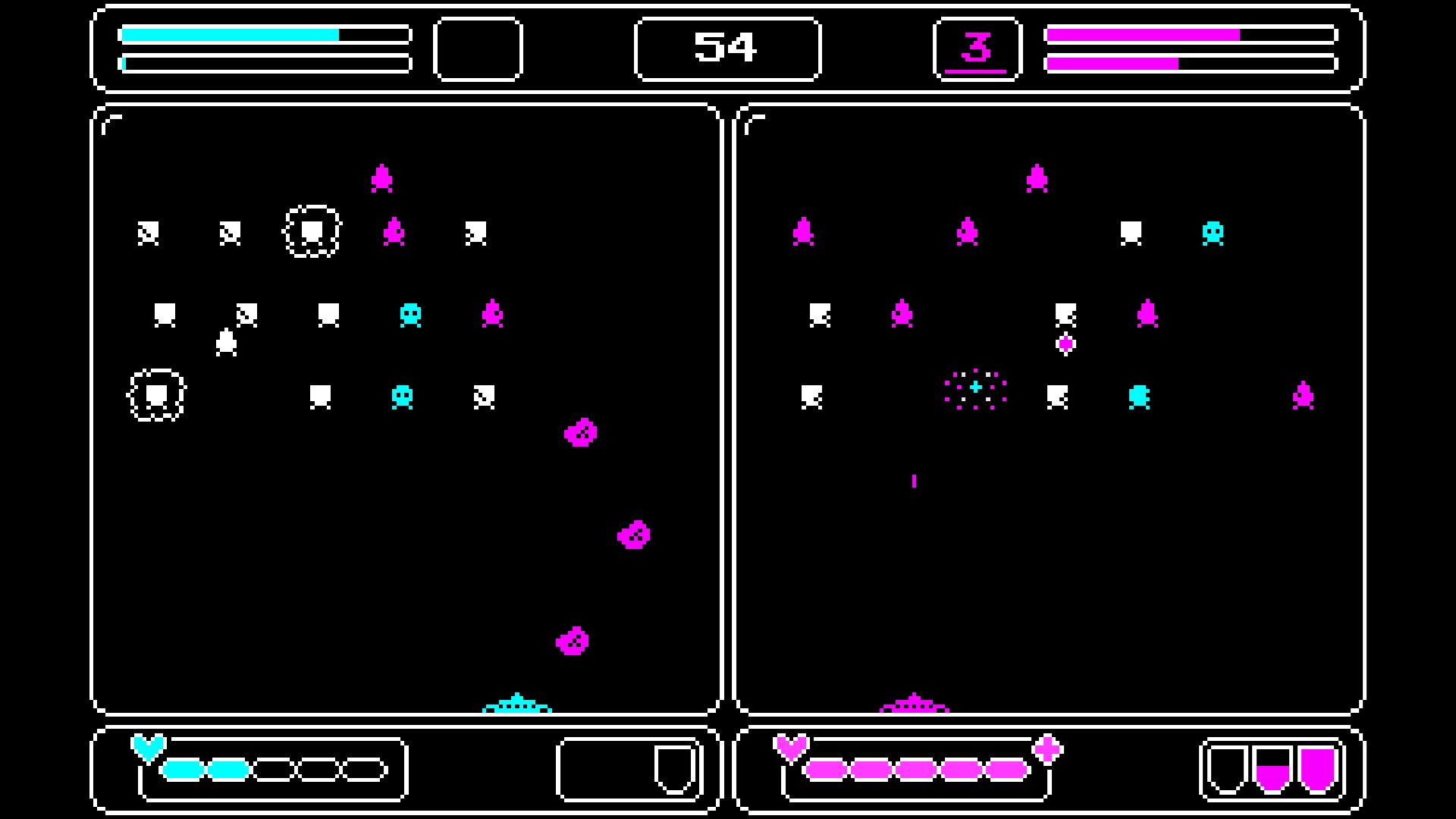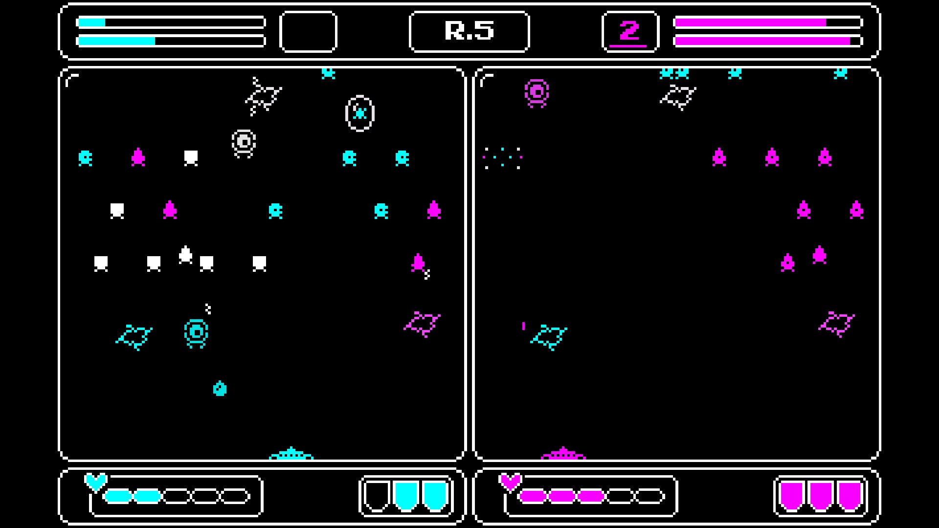So retro. Very cool, the split screen is a very interesting spin on classic space invaders.